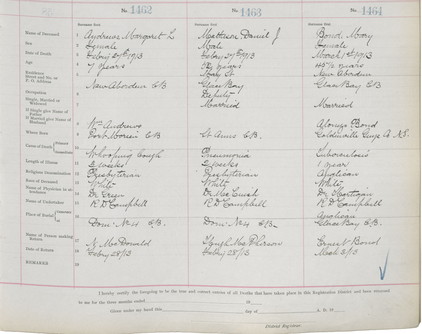 Death Registration: Year: 1913 book: 22 page: 244 number: 1464