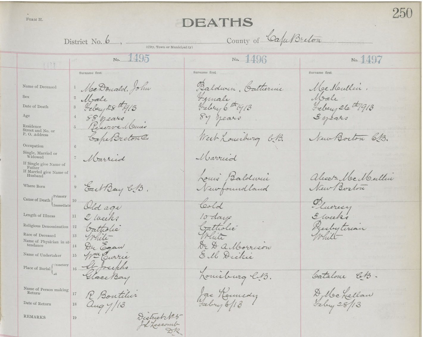 Male Death Registration: Year: 1913 book: 22 page: 250 number: 1497