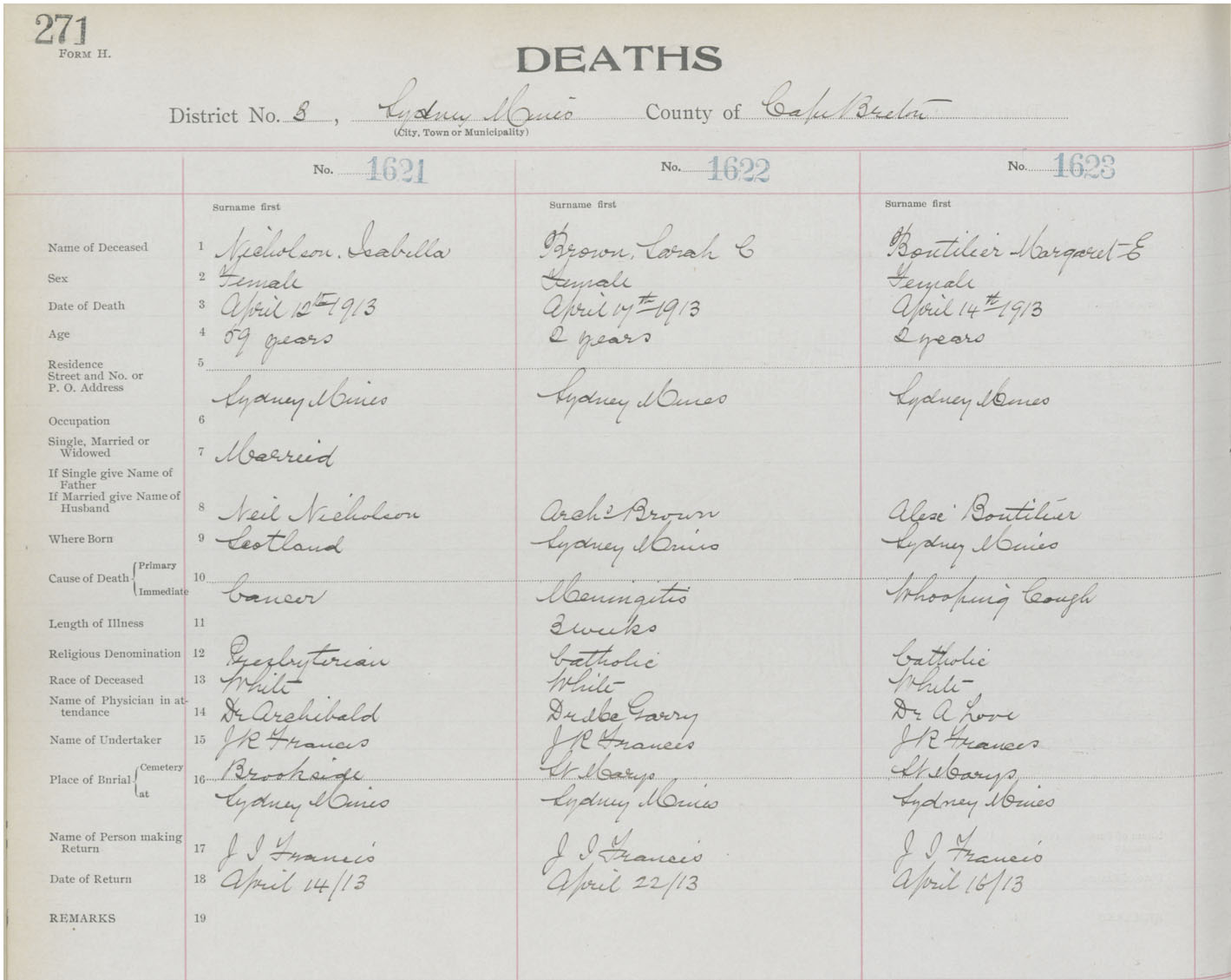 Death Registration: Year: 1913 book: 22 page: 271 number: 1621