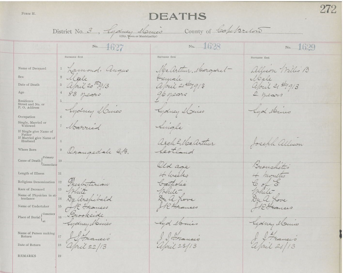 Death Registration: Year: 1913 book: 22 page: 272 number: 1627