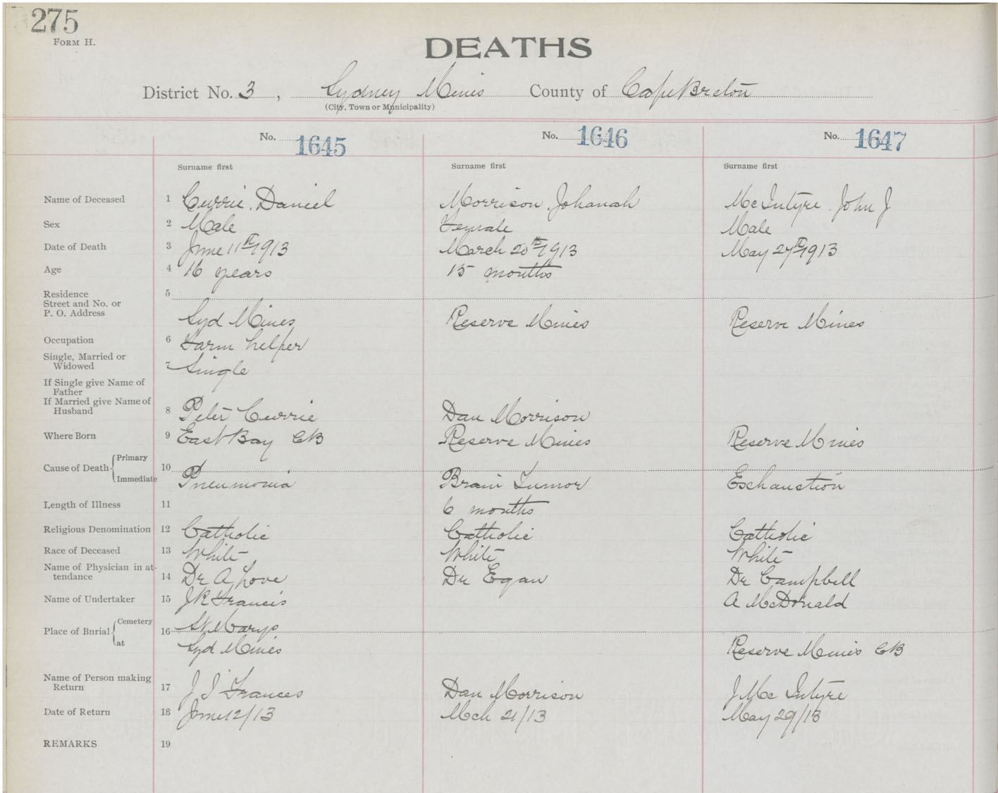 Death Registration: Year: 1913 book: 22 page: 275 number: 1645
