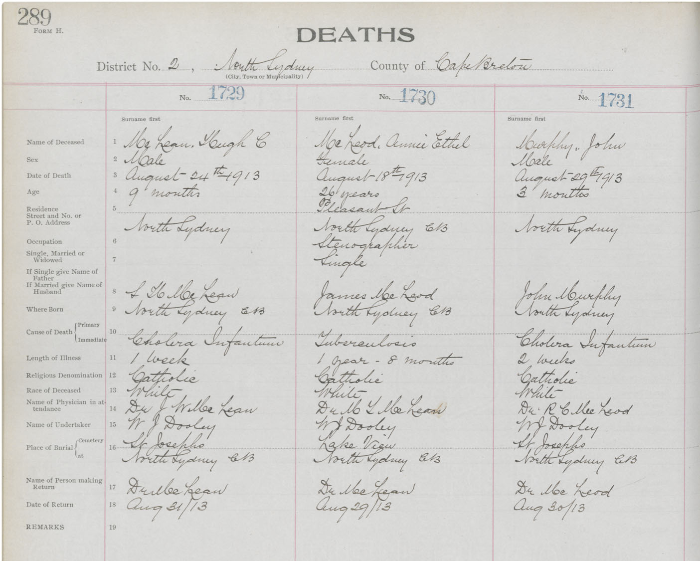 Death Registration: Year: 1913 book: 22 page: 289 number: 1729