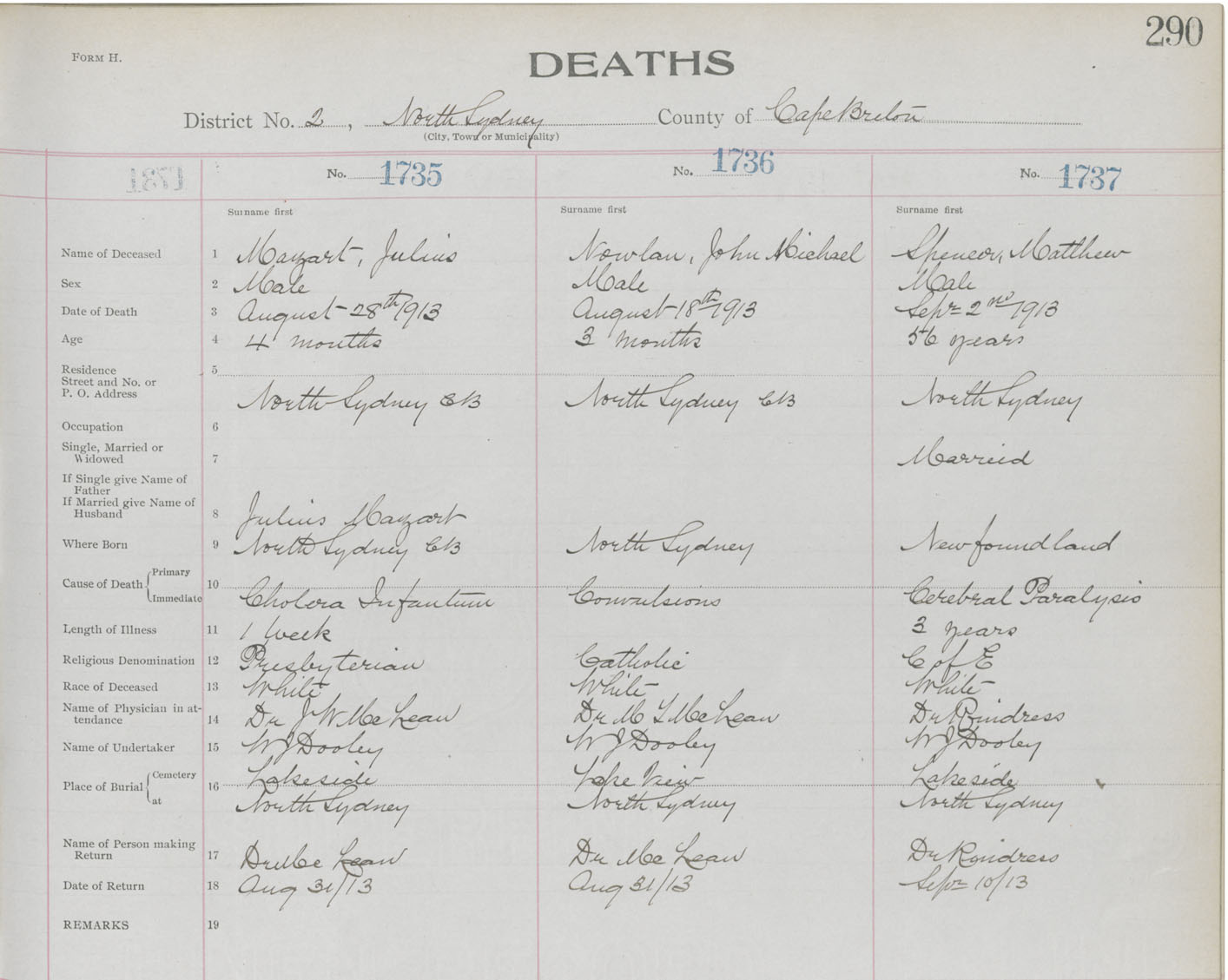 Death Registration: Year: 1913 book: 22 page: 290 number: 1735