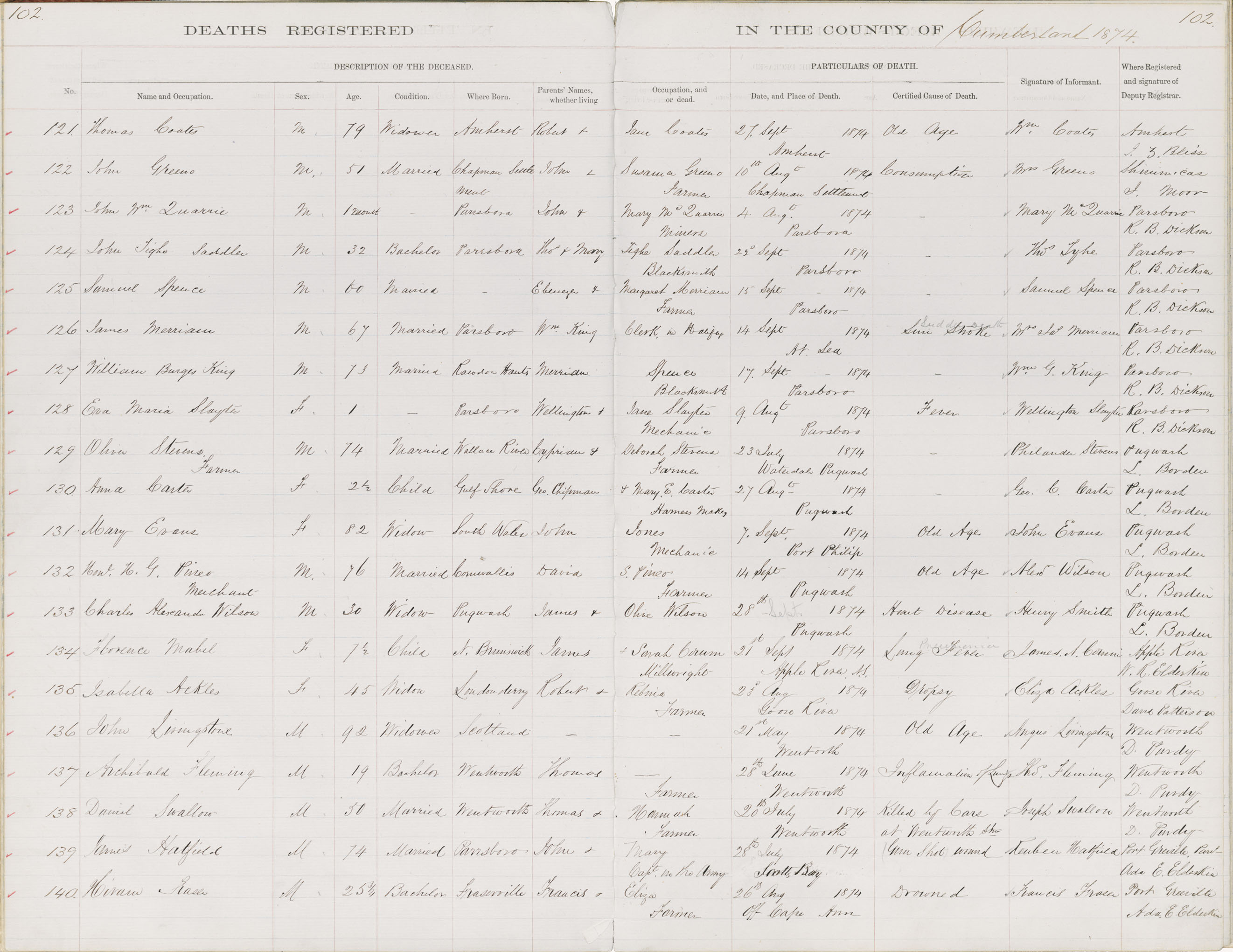 Death Registration: Year: 1874 book: 1805 page: 102 number: 121