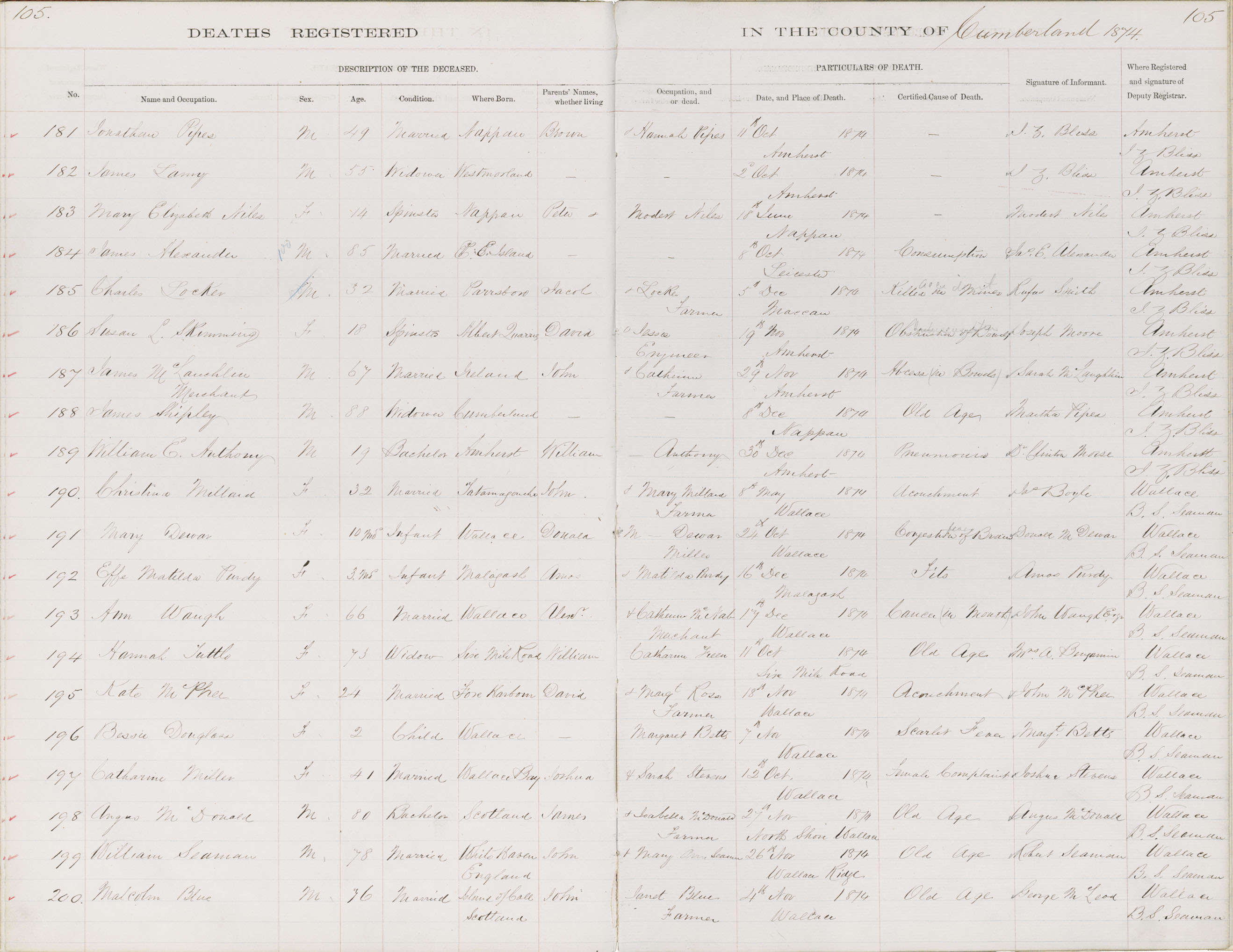 Death Registration: Year: 1874 book: 1805 page: 105 number: 181