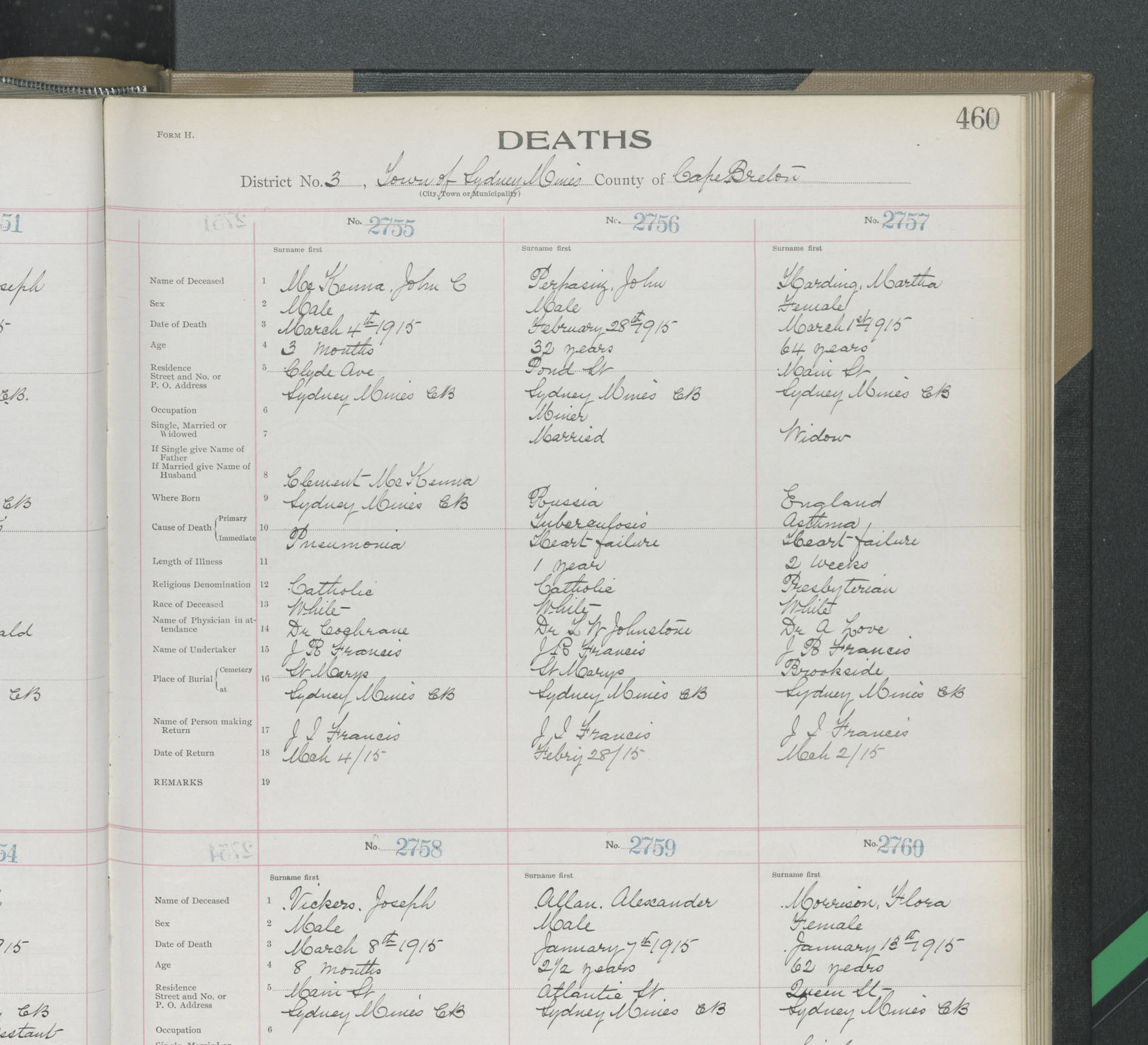 Death Registration: Year: 1915 book: 22 page: 460 number: 2755
