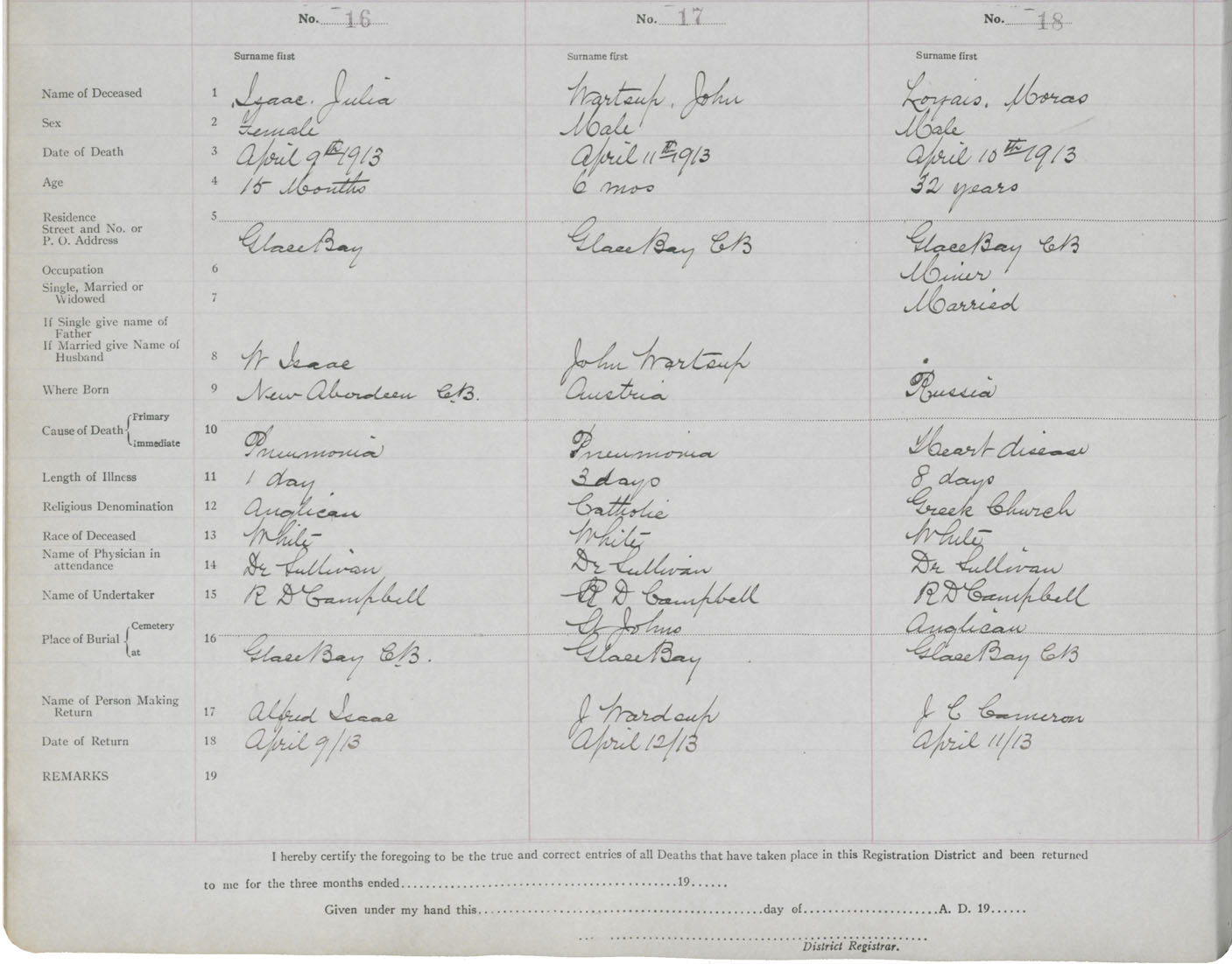 Death Registration: Year: 1913 book: 24 page: 3 number: 18