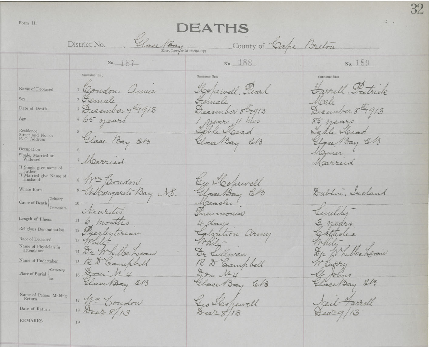 Death Registration: Year: 1913 book: 24 page: 32 number: 187