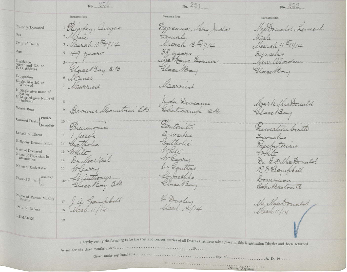 Death Registration: Year: 1914 book: 24 page: 42 number: 250