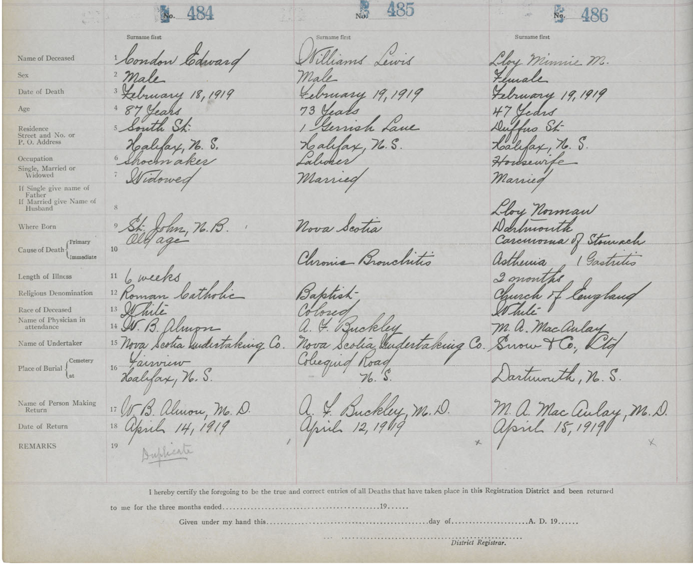 Death Registration: Year: 1919 book: 25 page: 81 number: 486