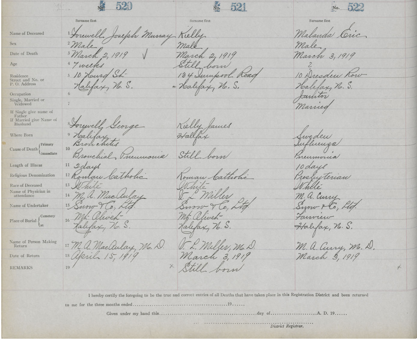 Male Death Registration: Year: 1919 book: 25 page: 87 number: 522