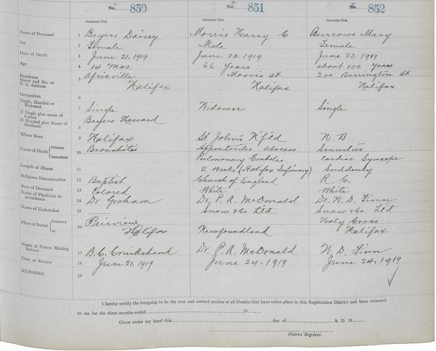 Death Registration: Year: 1919 book: 25 page: 142 number: 852