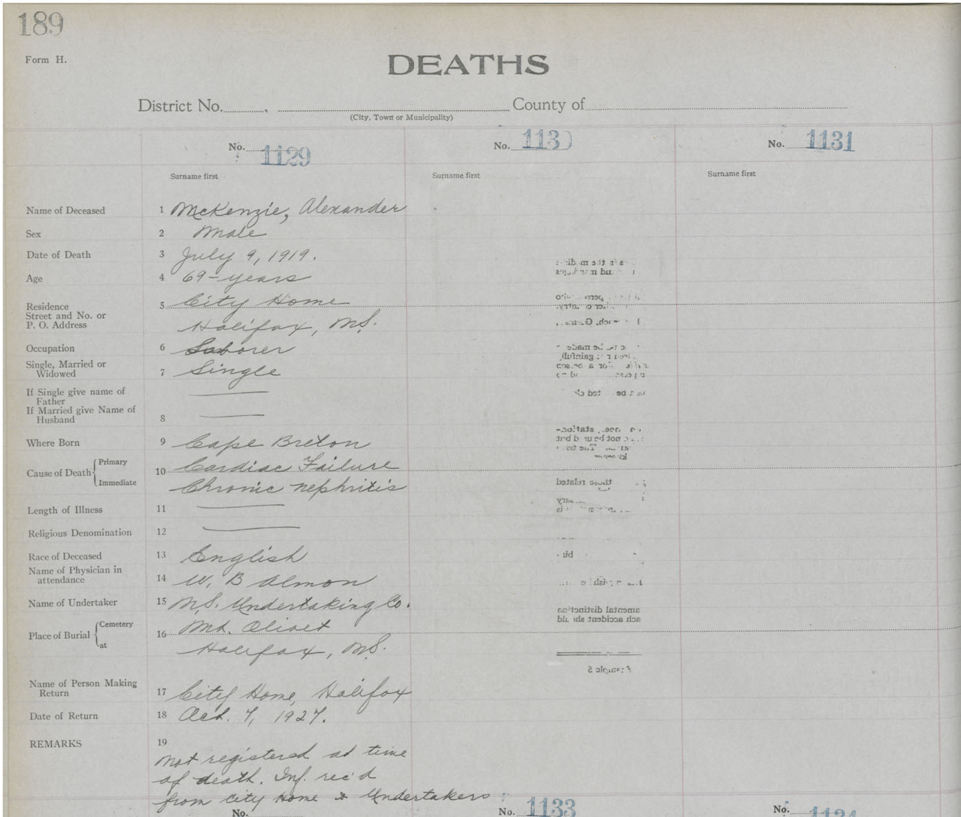 Death Registration: Year: 1919 book: 25 page: 189 number: 1129