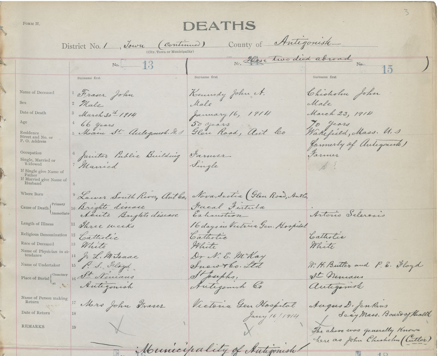 Male Death Registration: Year: 1914 book: 26 page: 3 number: 13