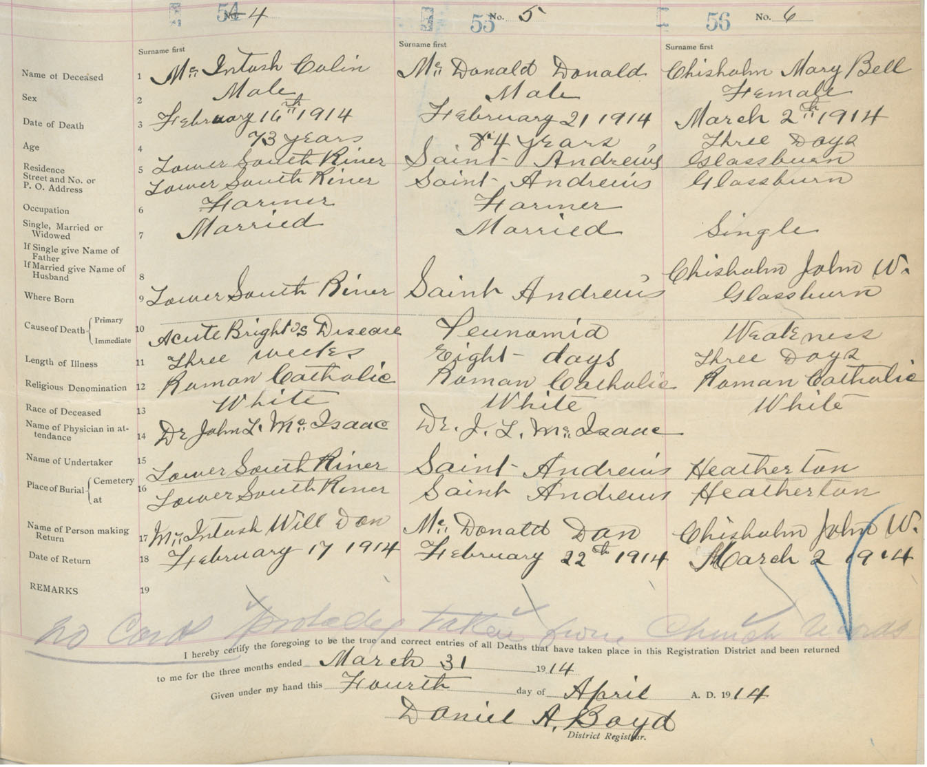 Male Death Registration: Year: 1914 book: 26 page: 17 number: 54