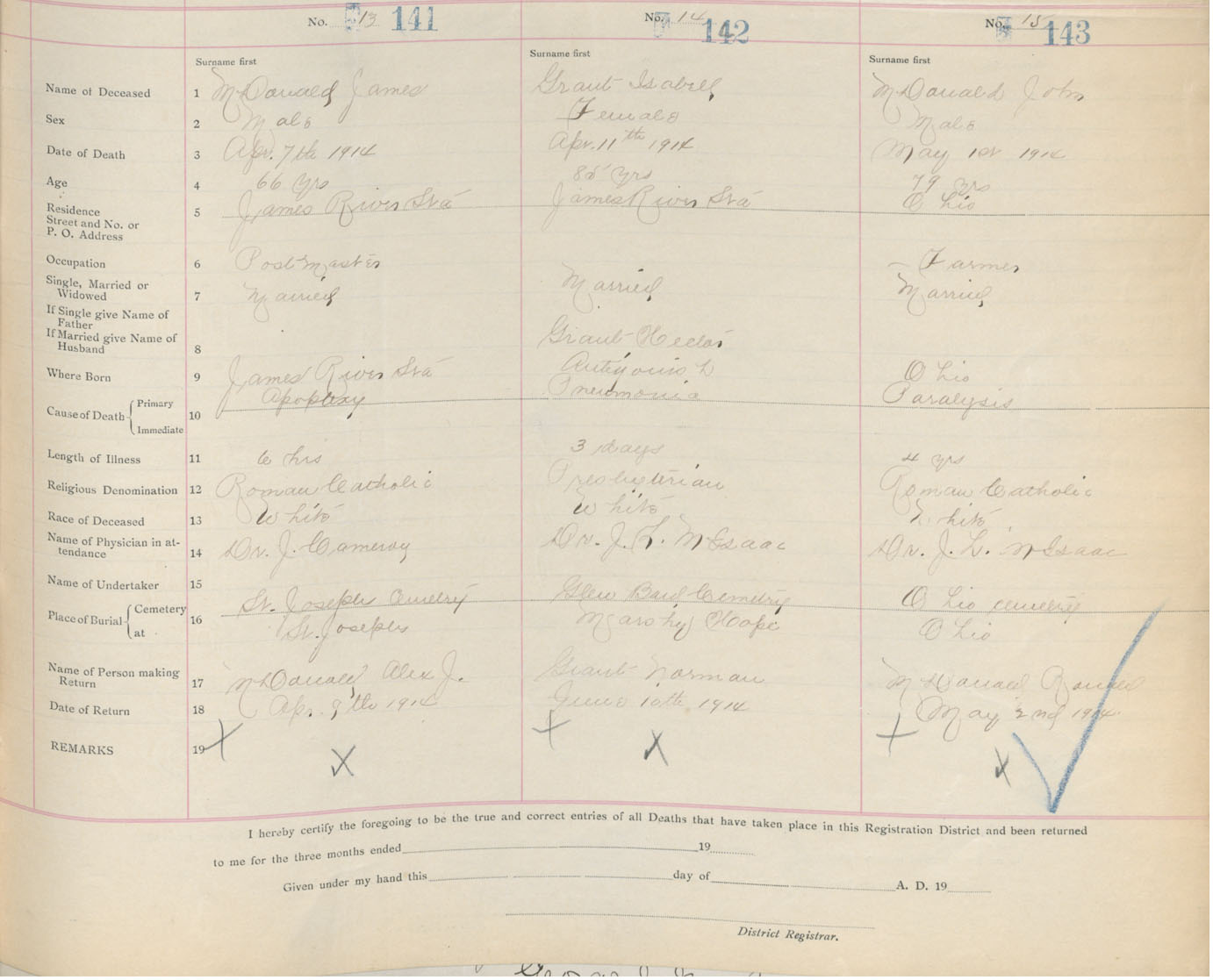 Male Death Registration: Year: 1914 book: 26 page: 59 number: 141