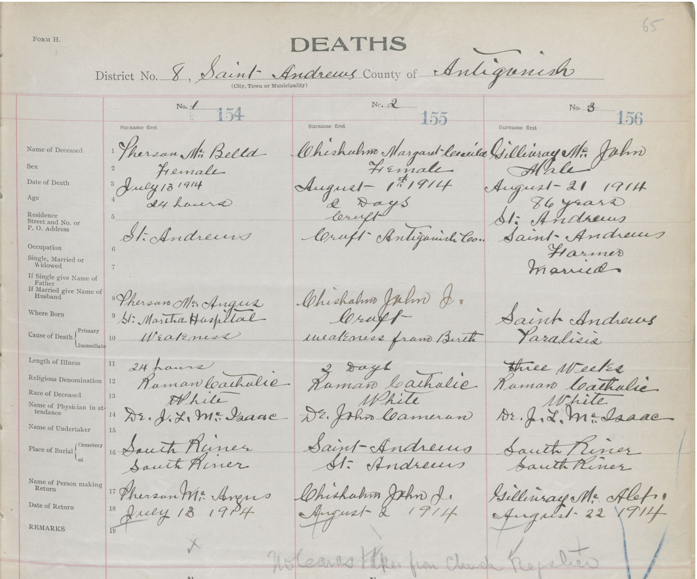 Female Death Registration: Year: 1914 book: 26 page: 65 number: 154