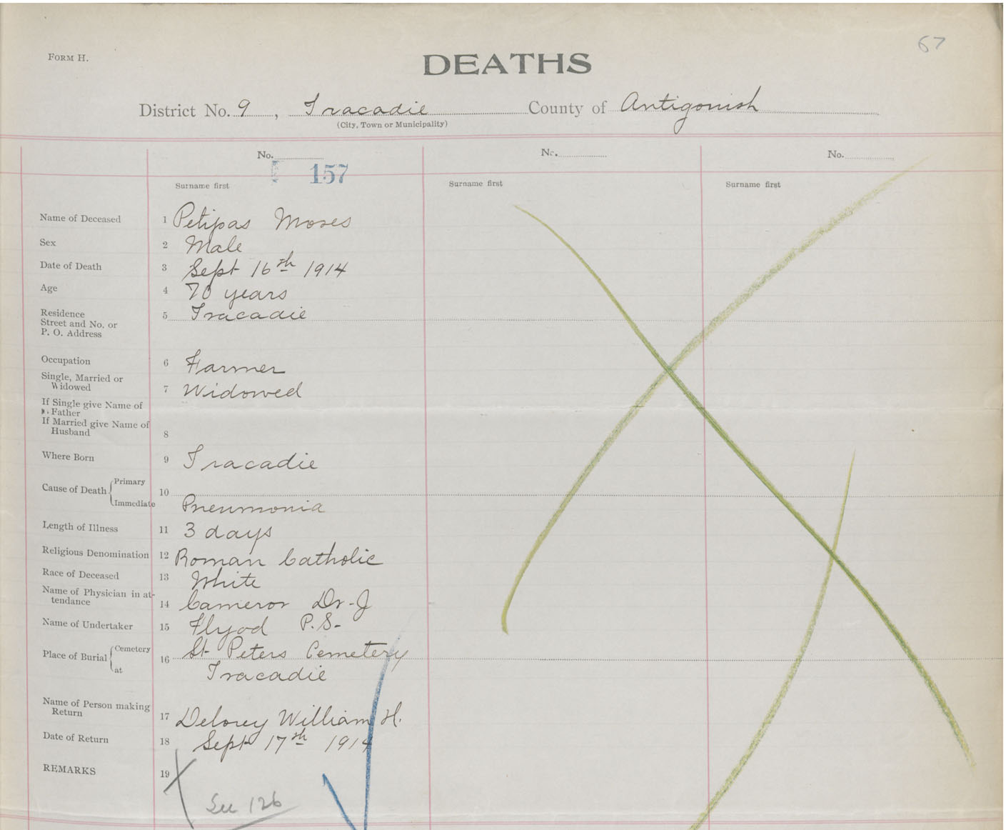 Male Death Registration: Year: 1914 book: 26 page: 67 number: 157