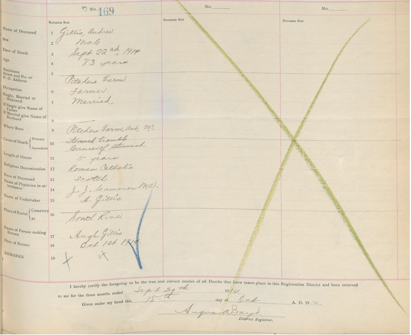 Male Death Registration: Year: 1914 book: 26 page: 73 number: 169