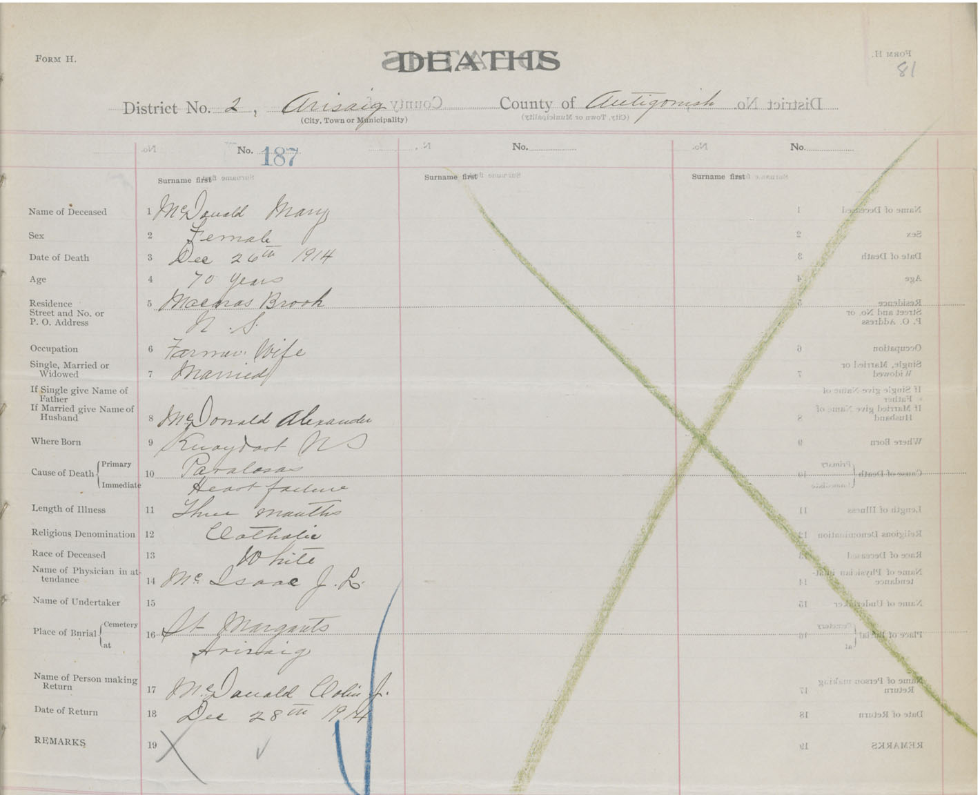 Female Death Registration: Year: 1914 book: 26 page: 81 number: 187
