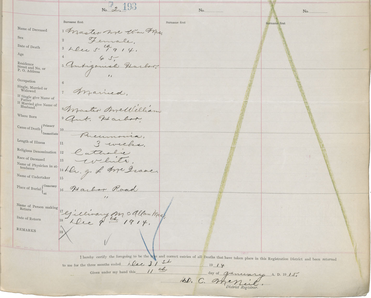 Female Death Registration: Year: 1914 book: 26 page: 85 number: 193