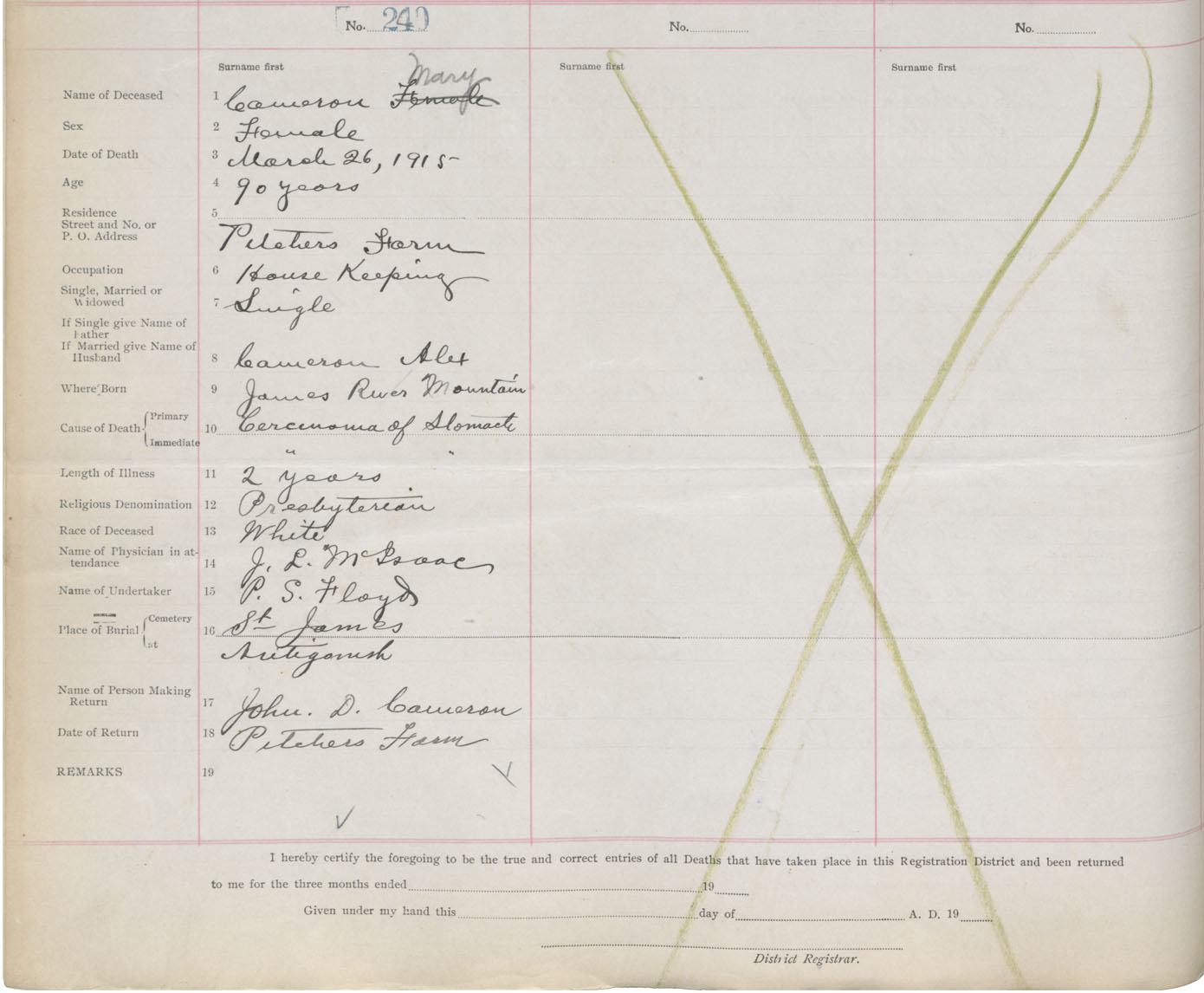 Female Death Registration: Year: 1915 book: 26 page: 108 number: 240