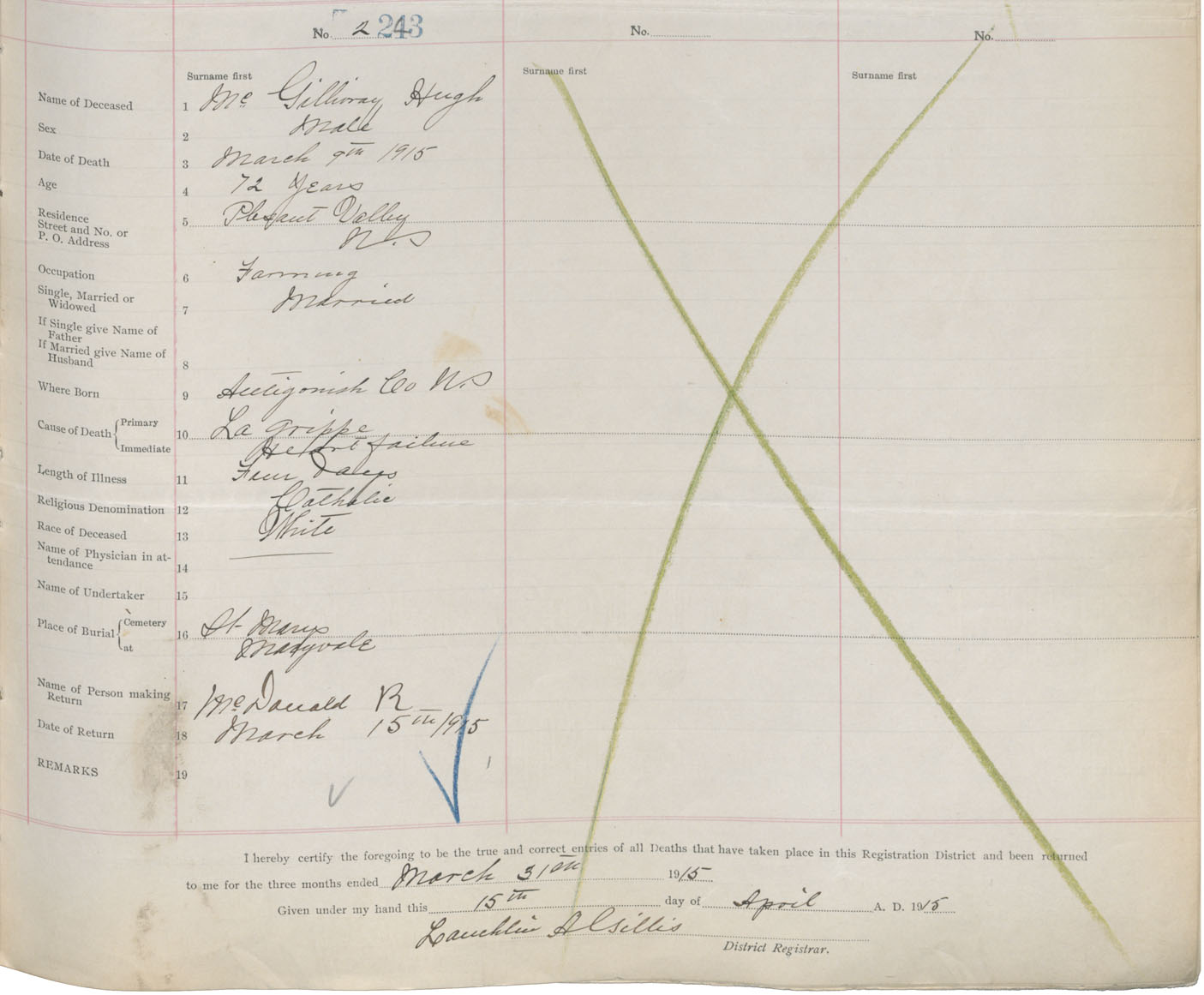 Male Death Registration: Year: 1915 book: 26 page: 109 number: 243