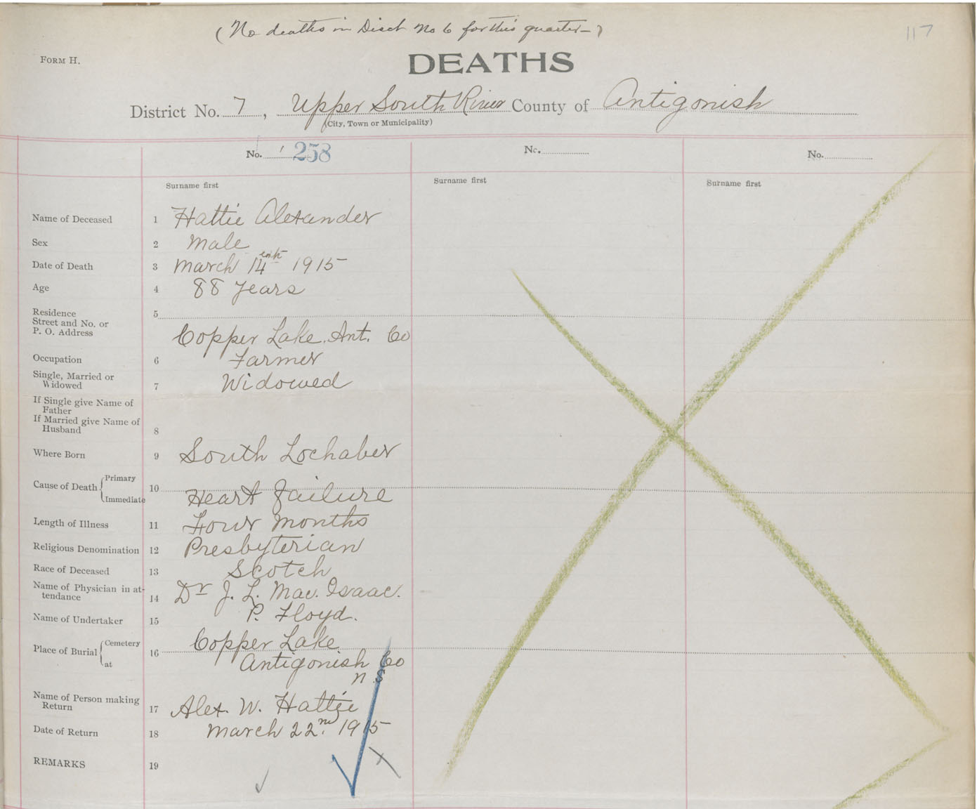 Male Death Registration: Year: 1915 book: 26 page: 117 number: 258
