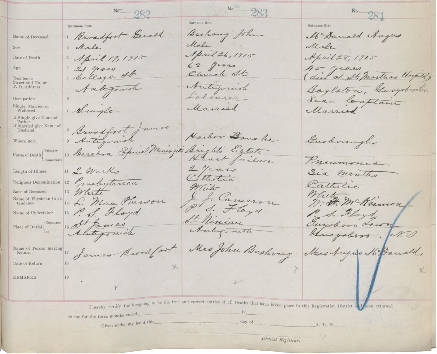 Male Death Registration: Year: 1915 book: 26 page: 131 number: 284