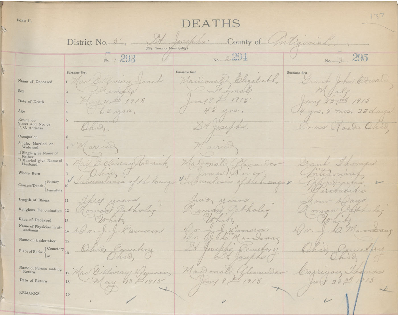 Female Death Registration: Year: 1915 book: 26 page: 137 number: 294