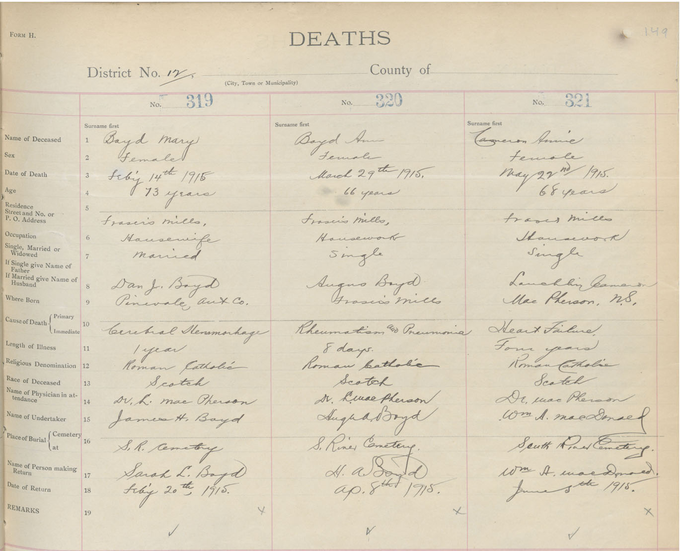 Female Death Registration: Year: 1915 book: 26 page: 149 number: 321