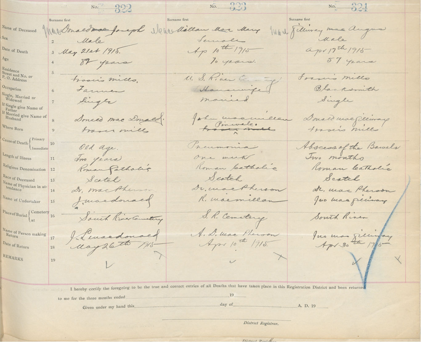 Male Death Registration: Year: 1915 book: 26 page: 149 number: 322