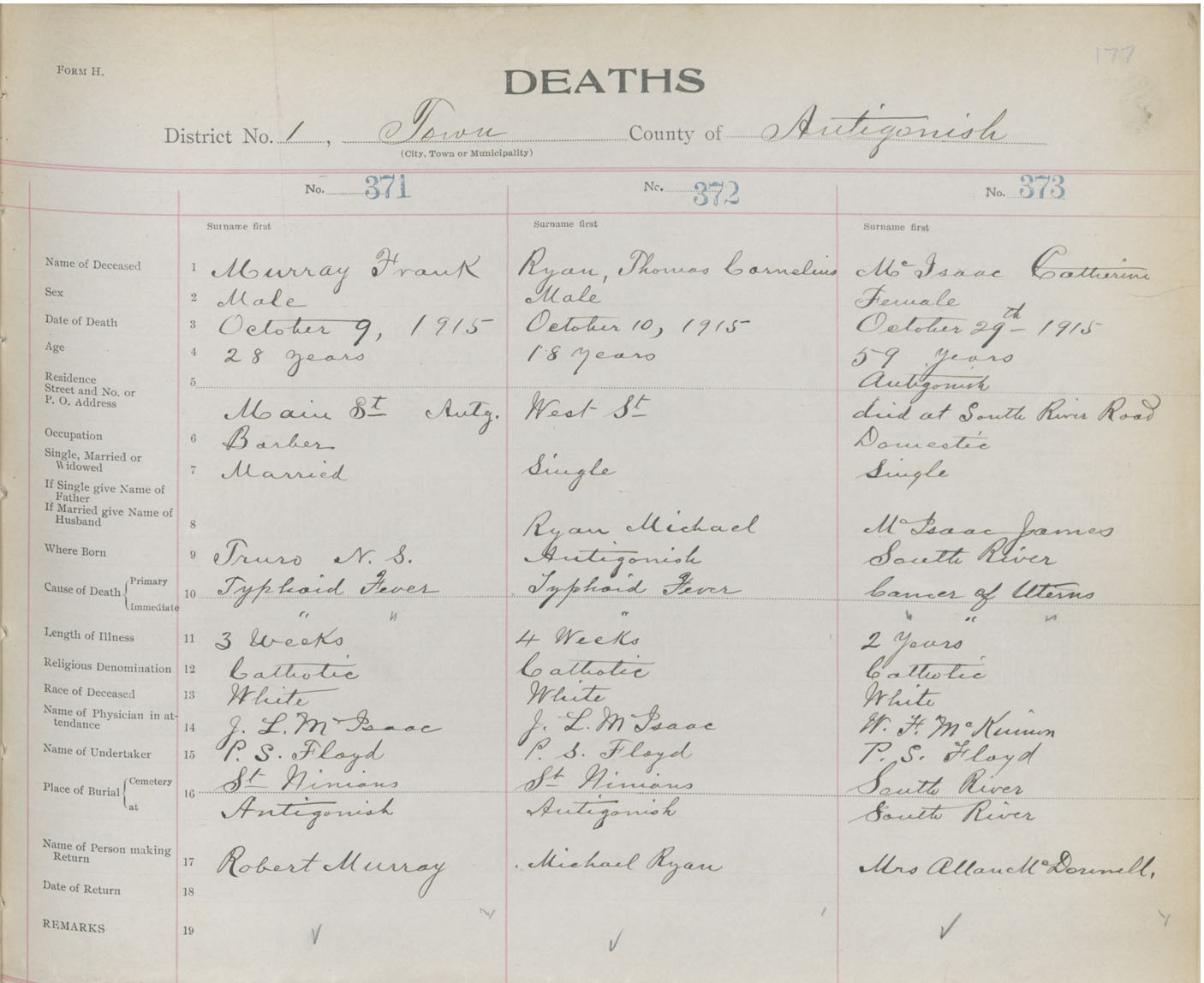 Male Death Registration: Year: 1915 book: 26 page: 177 number: 371