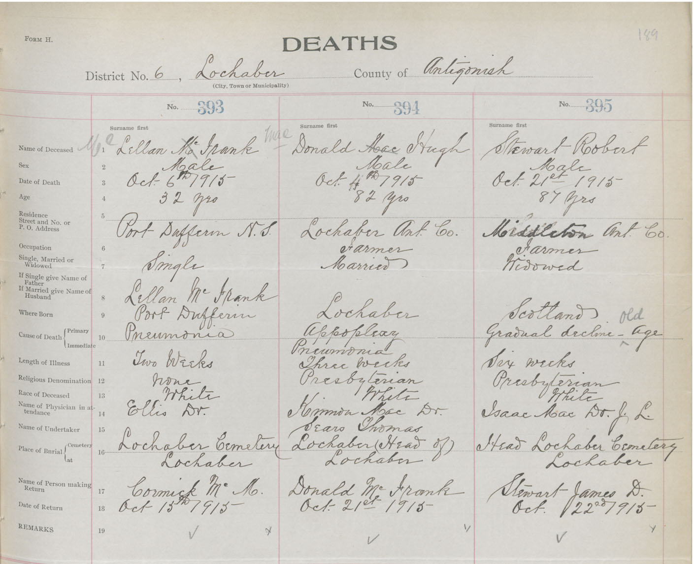 Male Death Registration: Year: 1915 book: 26 page: 189 number: 393