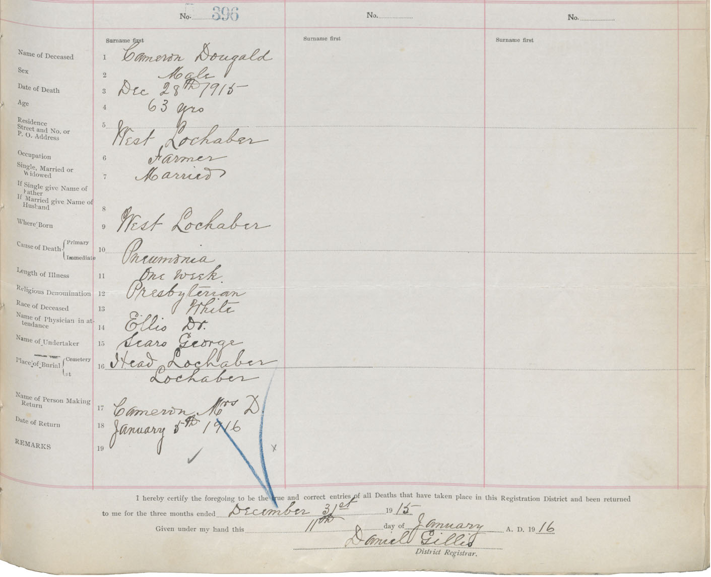 Male Death Registration: Year: 1915 book: 26 page: 189 number: 396