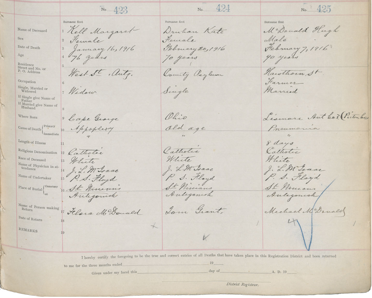 Male Death Registration: Year: 1916 book: 26 page: 203 number: 425
