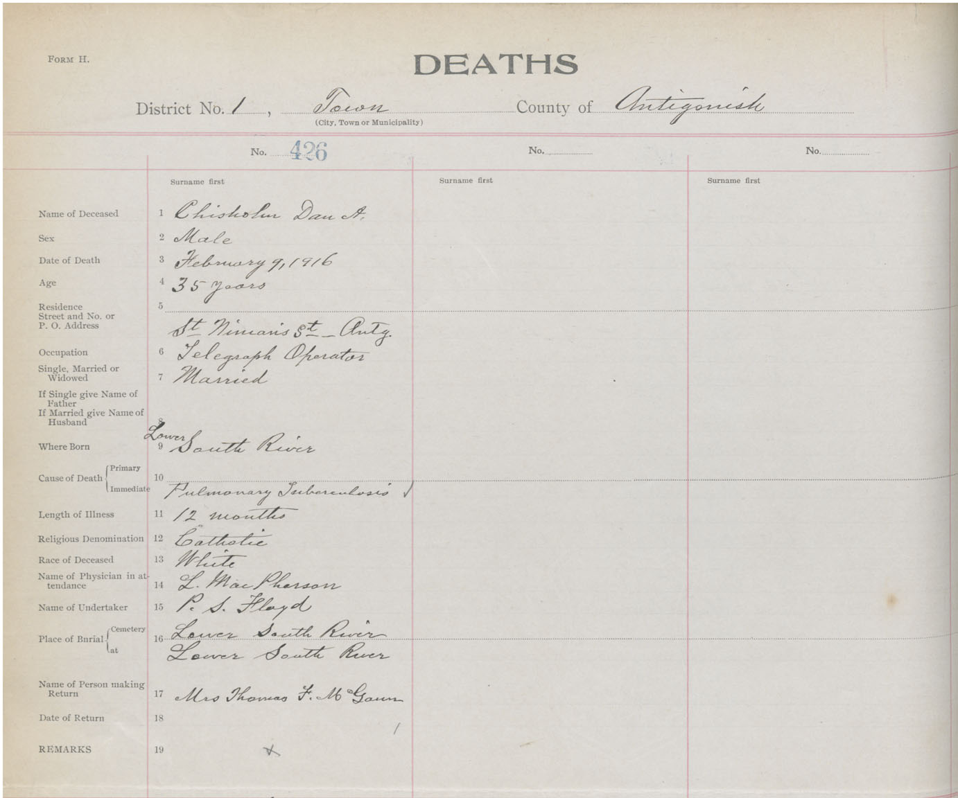 Male Death Registration: Year: 1916 book: 26 page: 204 number: 426
