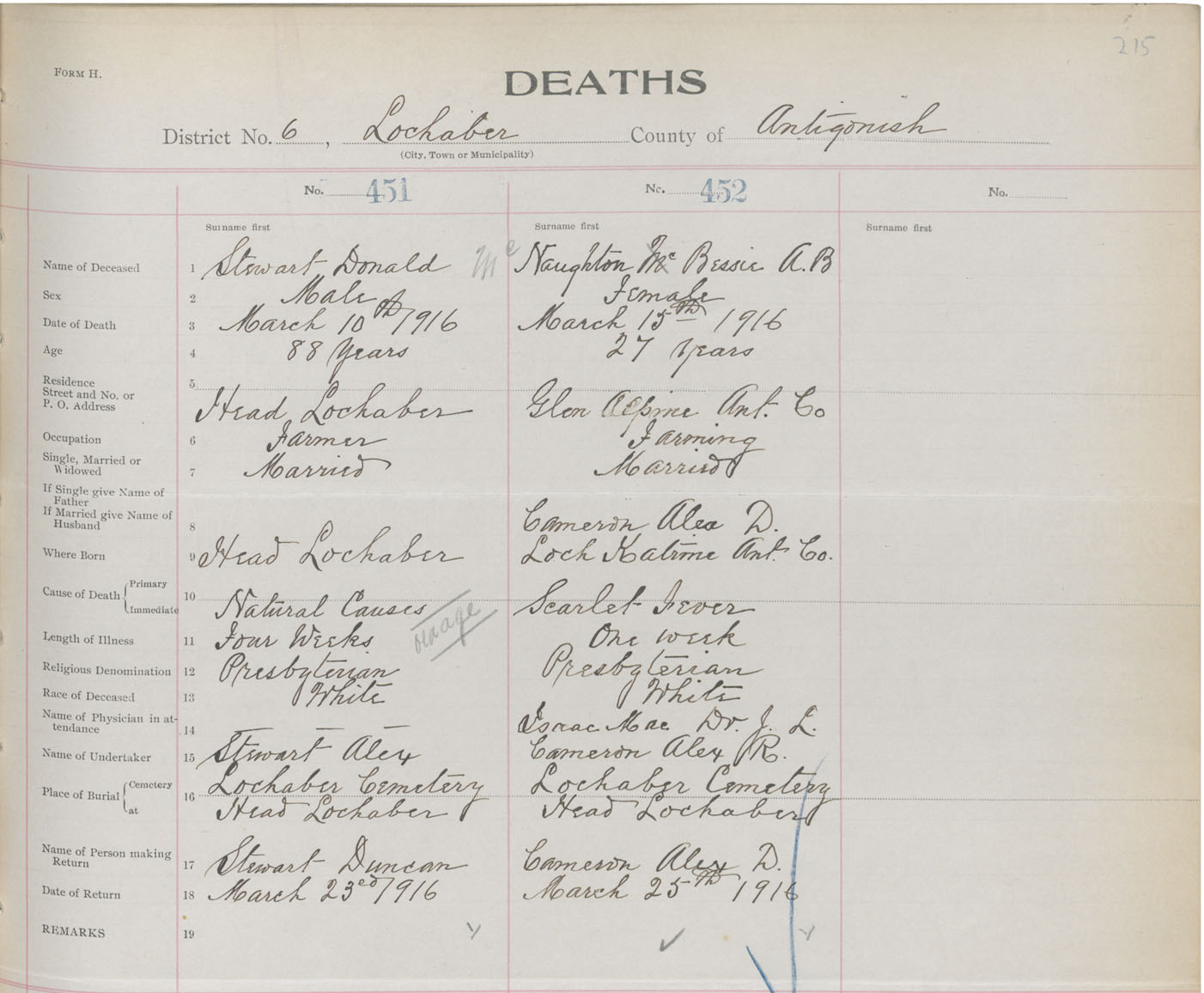 Female Death Registration: Year: 1916 book: 26 page: 215 number: 452