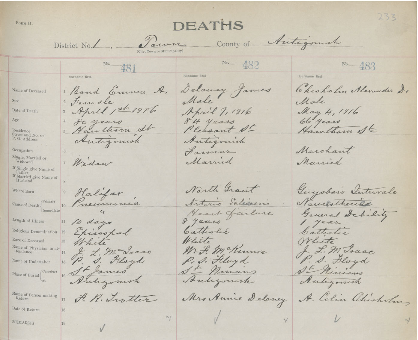 Female Death Registration: Year: 1916 book: 26 page: 233 number: 481