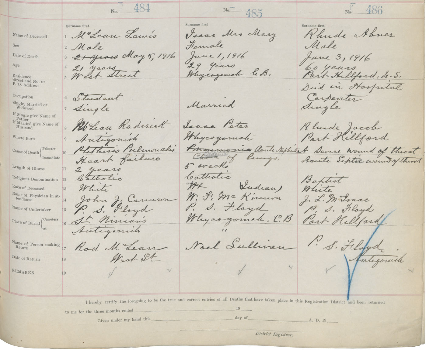 Male Death Registration: Year: 1916 book: 26 page: 233 number: 484
