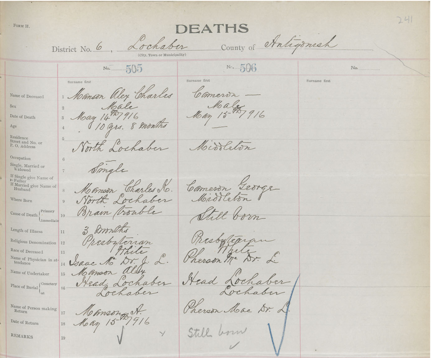 Male Death Registration: Year: 1916 book: 26 page: 241 number: 505