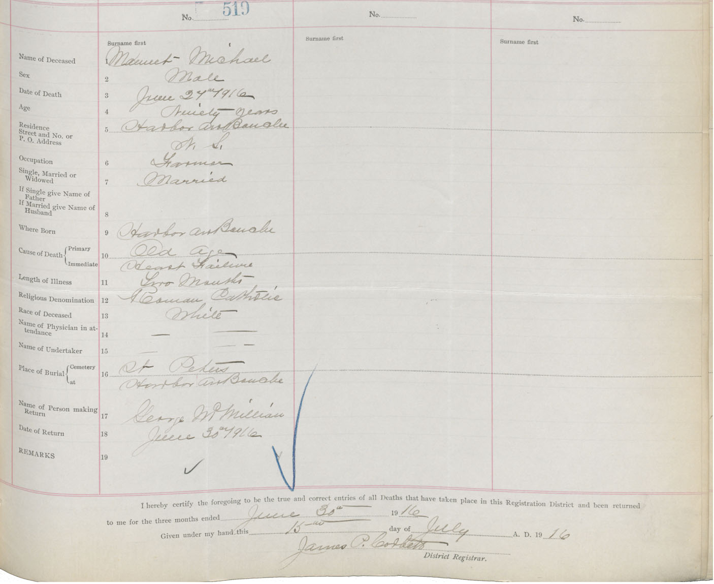 Male Death Registration: Year: 1916 book: 26 page: 247 number: 519