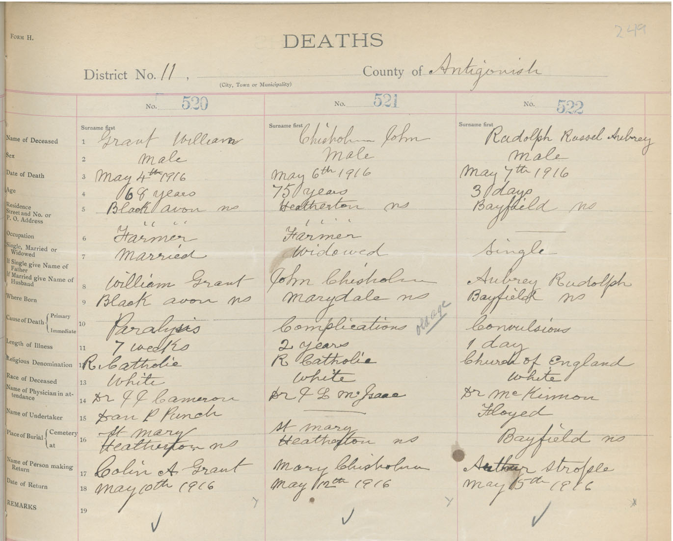 Male Death Registration: Year: 1916 book: 26 page: 249 number: 520