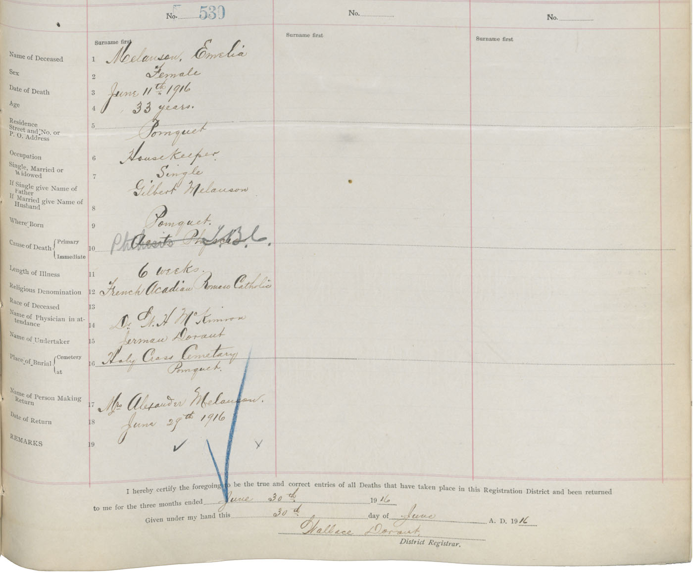 Female Death Registration: Year: 1916 book: 26 page: 253 number: 530