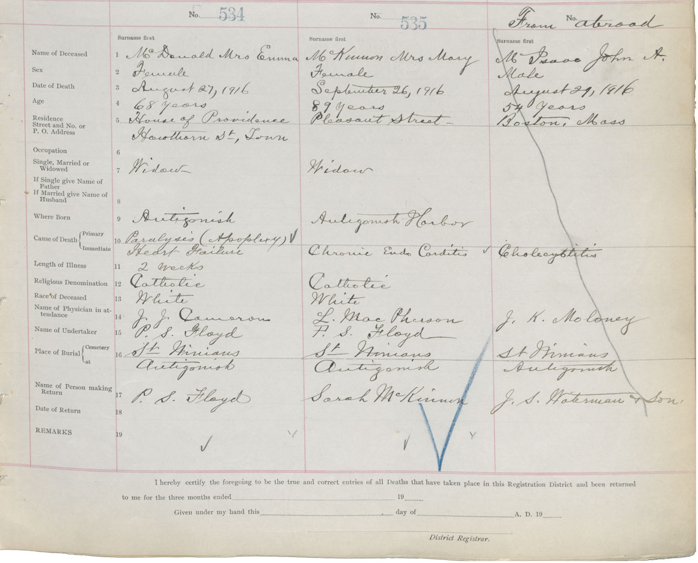 Female Death Registration: Year: 1916 book: 26 page: 255 number: 534