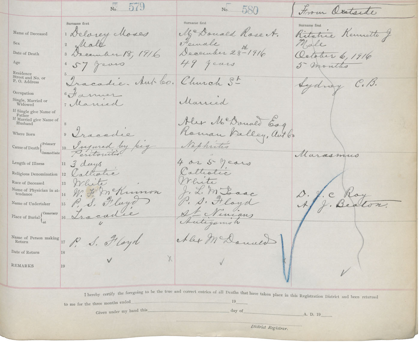 Male Death Registration: Year: 1916 book: 26 page: 277 number: 579