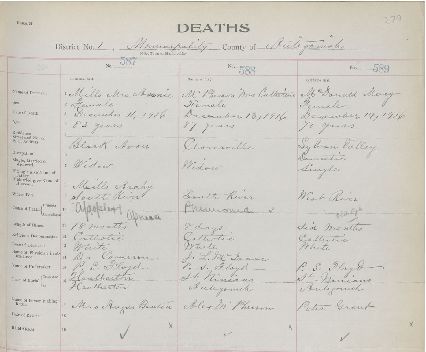Female Death Registration: Year: 1916 book: 26 page: 279 number: 587