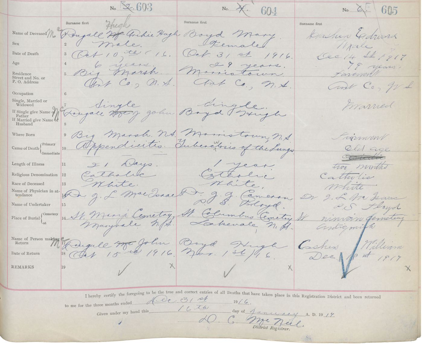 Male Death Registration: Year: 1916 book: 26 page: 285 number: 603