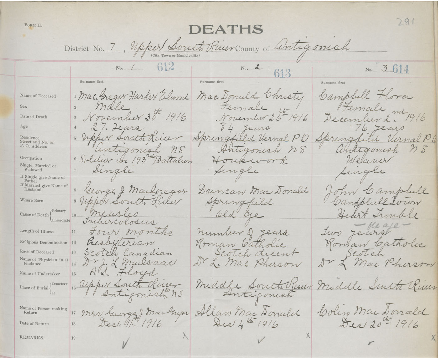 Male Death Registration: Year: 1916 book: 26 page: 291 number: 612