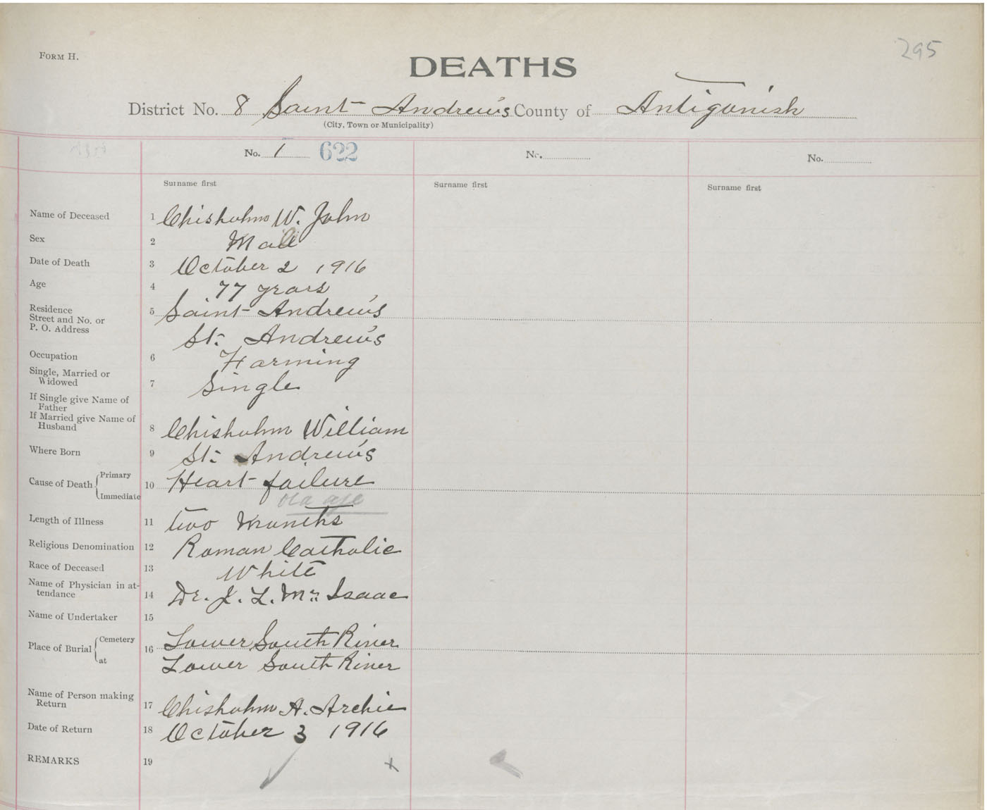 Male Death Registration: Year: 1916 book: 26 page: 295 number: 622